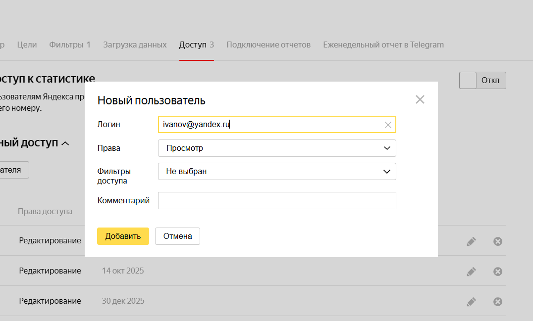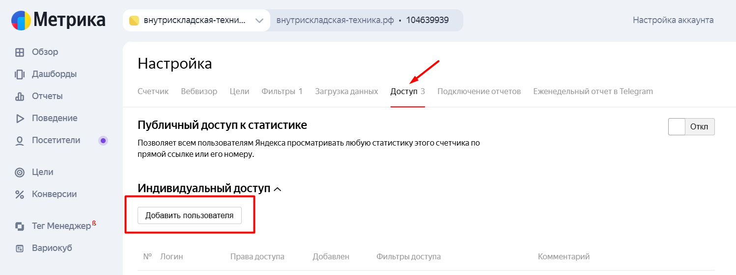 Для анализа эффективности работы интернет-маркетинга нам потребуется доступ к статистике вашего сайта. Предоставьте гостевой доступ — он позволяет только просматривать данные, без права редактирования настроек.