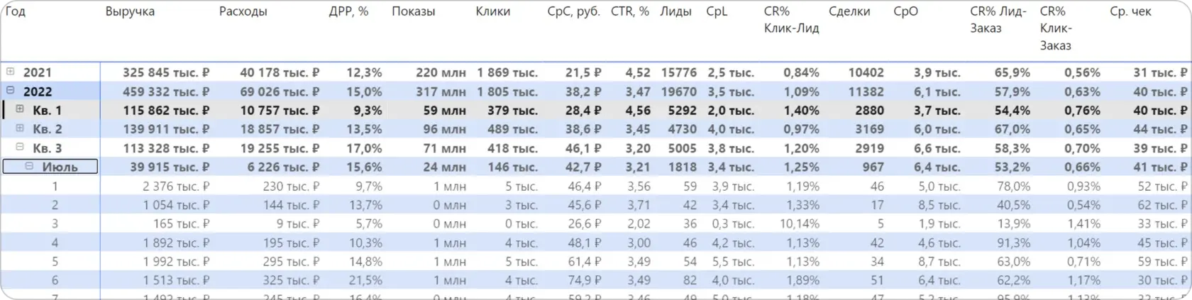С его помощью менеджмент компании может эффективно распоряжаться маркетинговым бюджетом и принимать верные, своевременные решения. А так же оперативно отслеживать все интересующие показатели и не тратить время на их выгрузку/сопоставление/обработку.