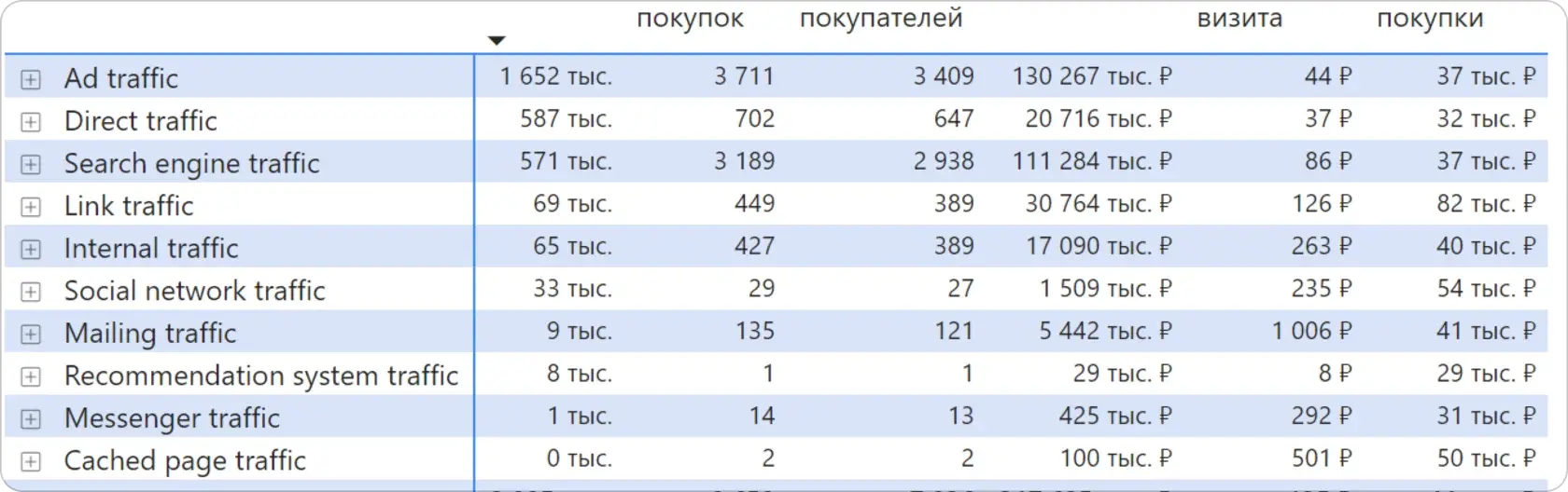 • Качество трафика: Сравнение источников трафика, которое наглядно показывает, что большое количество визитов не гарантирует продажи (например, прямые заходы vs поисковый трафик).